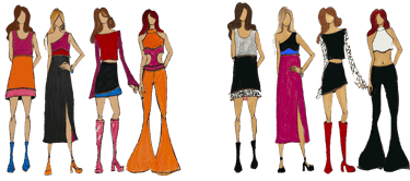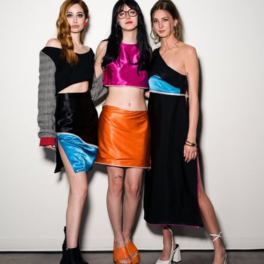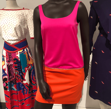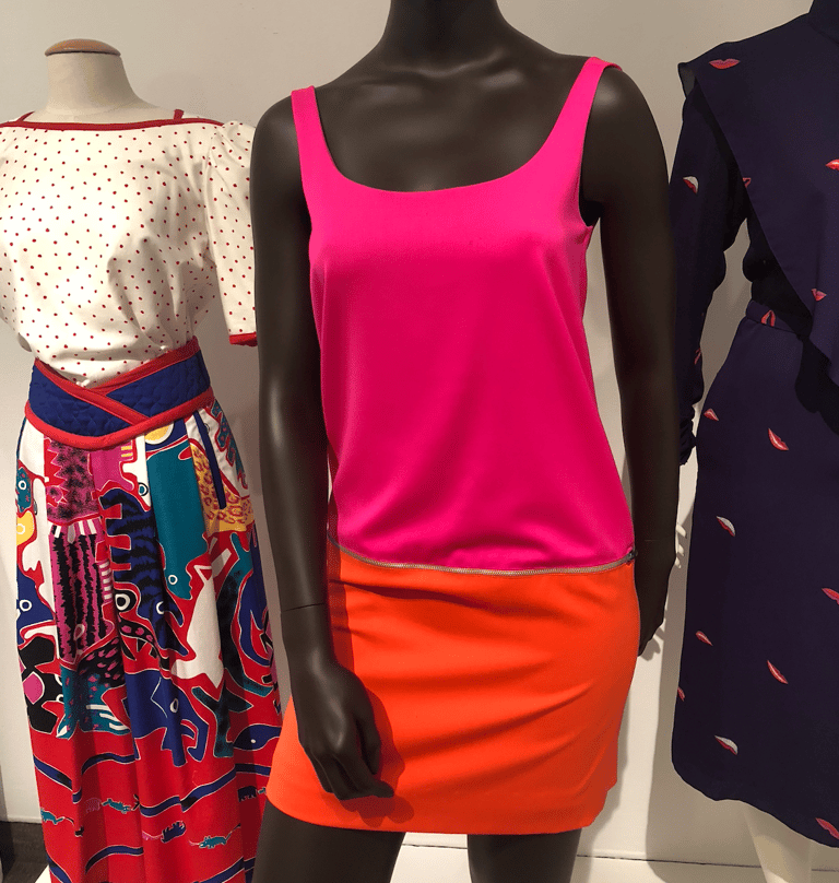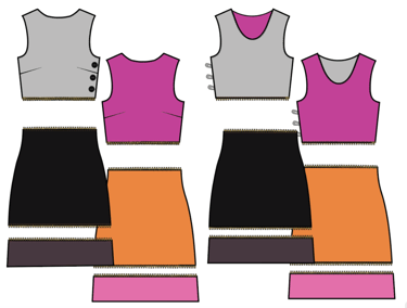 Each piece in the line is fully reversible, offering two different colorways. The two dress looks are also fully interchangeable; the skirts and tops can be worn zipped together or apart, as well as swapped with the alternate top. The two short skirt pieces also come complete with bottom sections, able to be worn zipped on or off, for a longer colorful look or a more simplistic mini.