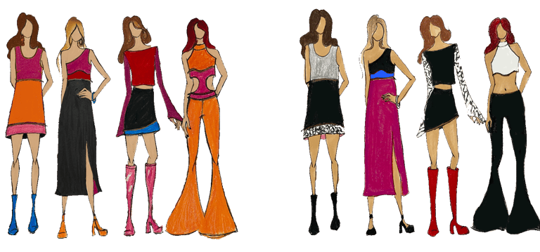 Beginning sketches of silhouette, color blocking, and modular construction. Technical flats lay out each colorway in the line and show how each piece separates.